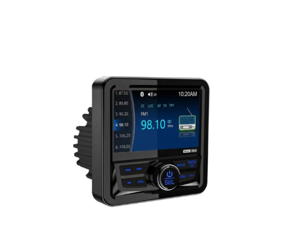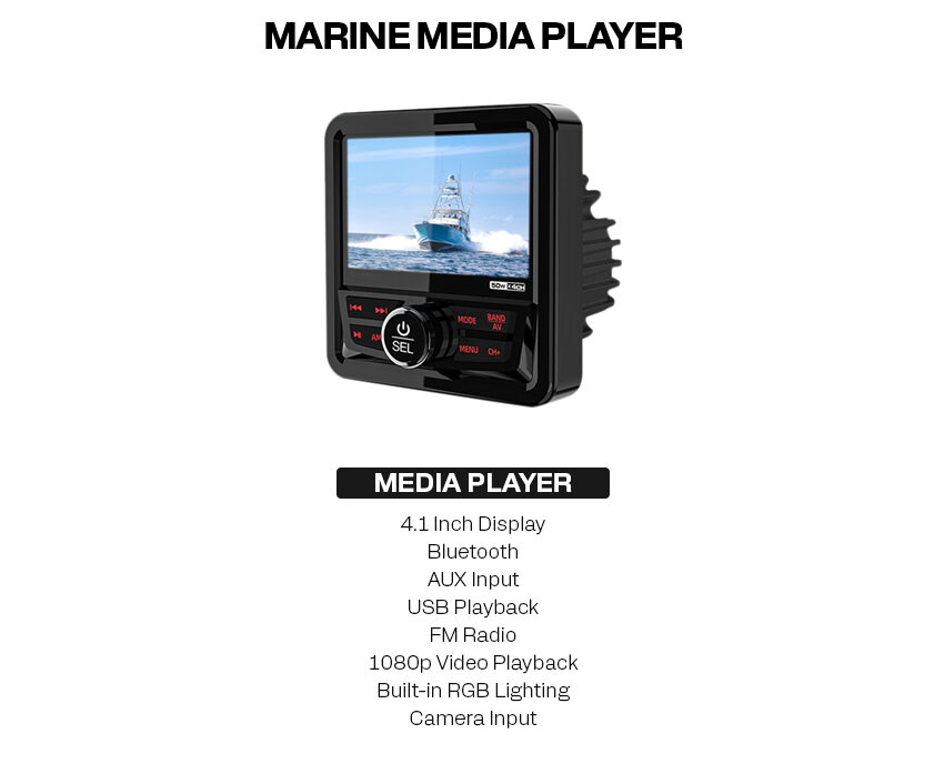 IPX5 weather-resistant 4.1″ marine media player with Bluetooth, USB playback, AM/FM radio, video playback, and camera input. Includes built-in RGB lighting.