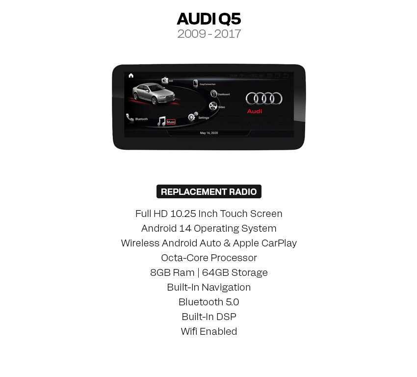 Experience the ultimate driving experience with our Audi Q5 replacement radio. This 10.25-inch touchscreen unit offers full factory integration, Android Auto, Apple CarPlay, and wireless connectivity. Powered by a Snapdragon Qualcomm processor, it delivers fast performance, ample storage, and built-in navigation.
