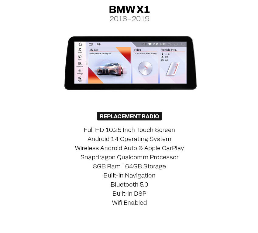 Experience the ultimate driving experience with our BMW X1 replacement radio. This 10.25-inch touchscreen unit offers full factory integration, Android Auto, Apple CarPlay, and wireless connectivity. Powered by a Snapdragon Qualcomm processor, it delivers fast performance, ample storage, and built-in navigation.