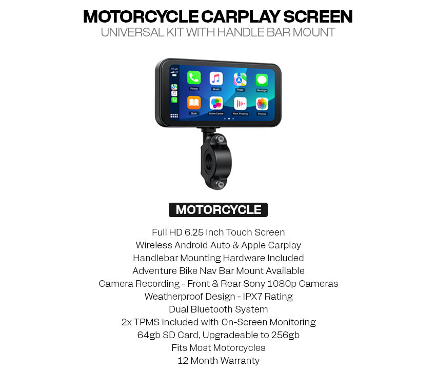 A rugged 6.25” touchscreen CarPlay & Android Auto kit for motorcycles with a handlebar mount, IPX7 weatherproof design, dual Bluetooth, front & rear 1080p cameras, tyre pressure monitors, and a 64GB SD card.